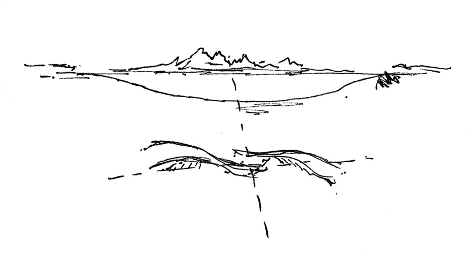 在不打破建筑形式和神秘感的前提下,这个设计希望尽可能的与景观相融合,保持谦虚的形态,而不是从景观中突出出来。