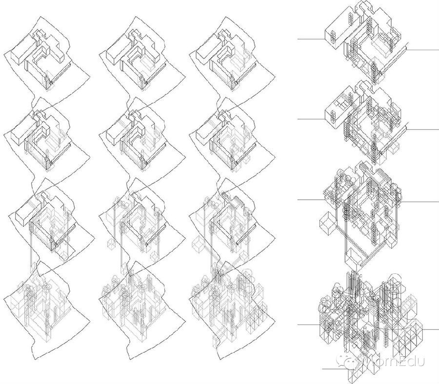左半部分的12张图展示设计的发展过程(左上角开始,右下角结束),右侧四张图展示该过程中纵向交通方式与周围空间之间的组合关系。