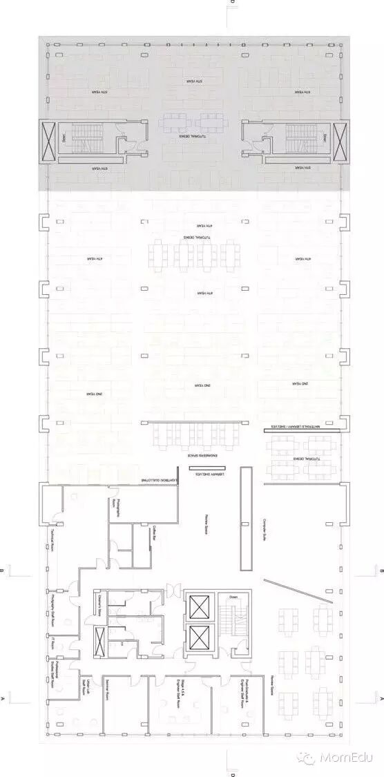 轴测图展示功能分布,结构框架右边一个剖面深入剖析结构的节点。但这两张图中,最明显的特点依旧是横向的贯通性 和 纵向的视觉感。