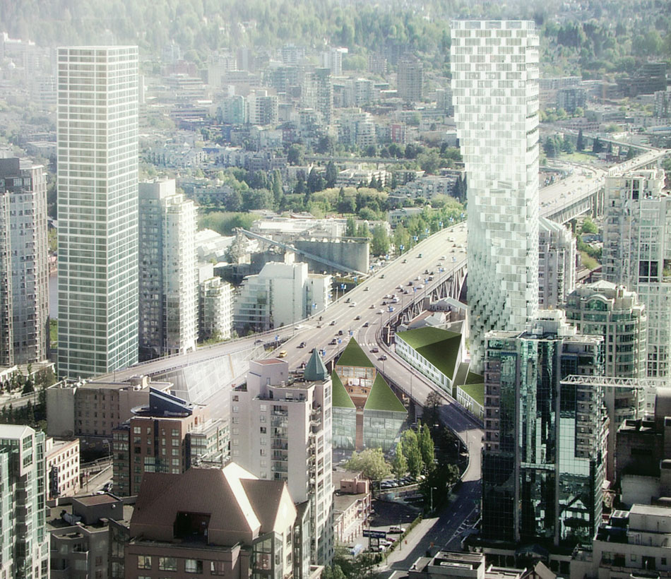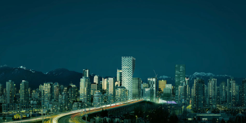 view of beach + howe tower in the context of the vancouver city skyline ground view of the slender podium that widens as it clears noise and visual pollution