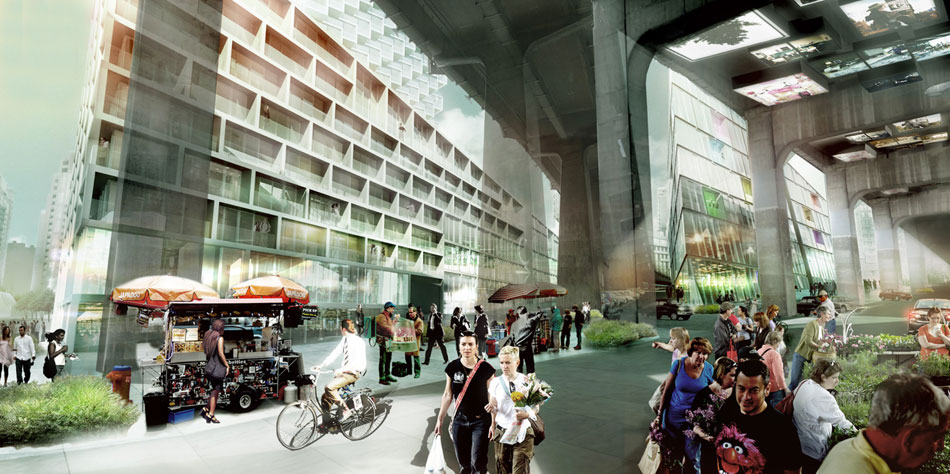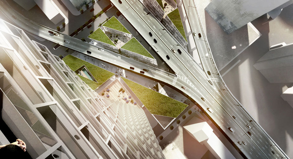 塔下部的裙房形成了可以激活城市活力的步行通道。项目是工作,住宅,商业的混合群建筑,是一个开放 的社区中心,是密集车流下面的新城市空间形态,是基础设施,社会福利。 the more than 50-storey structure, positioned on a triangular lot at granville and pacific streets, will mark the entry point into downtown vancouver from the bridge that connects granville island to the city. the challenging site that is trisected by the nearby overpass, as well as other urban set backs, has seen BIG architects employ a 10-storey podium base tower that maximizes its mass where it has the most impact. off-set 30 metres from the highway, as it extends upwards, the high-rise clears the zone of noise and visual pollution widening in its ascension, topping out in a manner that overcomes its restrictions. at its upper most floors, the residential complex offers expansive visual access to the diversity of the built and natural landscape (water and mountains) that vancouver is known for.