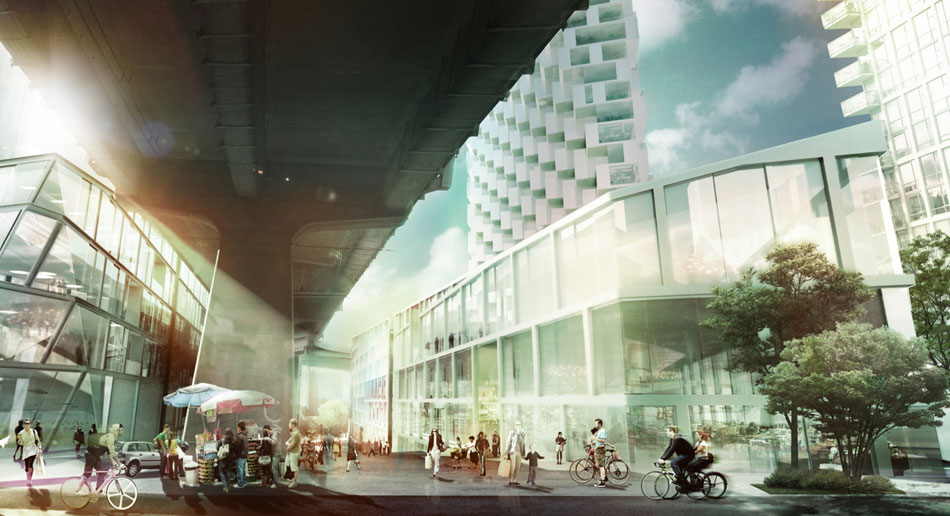 as a response to its confined location, a major focus has been put on the integration of communal areas to existing streets at the ground level, providing the neighbourhood with a variety of open and covered zones of varying scales for a number of activities and events. as an extension of the property, triangular complexes opposite the intersection of granville and pacific streets, will be composed of intimately scaled spaces for working, shopping and leisure that face onto public plazas and pathways, transforming the city’s infrastructure, set to become one of vancouver’s most prominent locations  在塔对面的六层楼三角复合建筑将提供额外的办公和零售场所