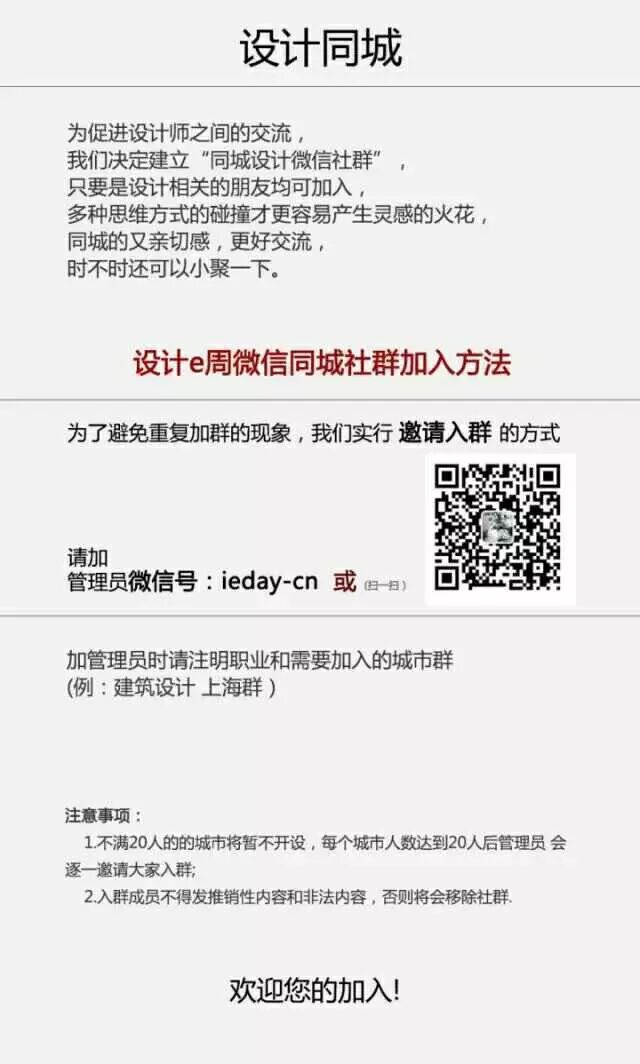 已开放社群: 目前已经开放的城市社群有北京、上海、广州、深圳、南京、成都、杭州、武汉、西安、苏州、沈阳、青岛,其他城市仍需再等些时日! 另外开放的有设计e周建筑社群、景观社群、规划社群,其他设计专业的请找微信号:ieday-cn报名,注明行业+城市。